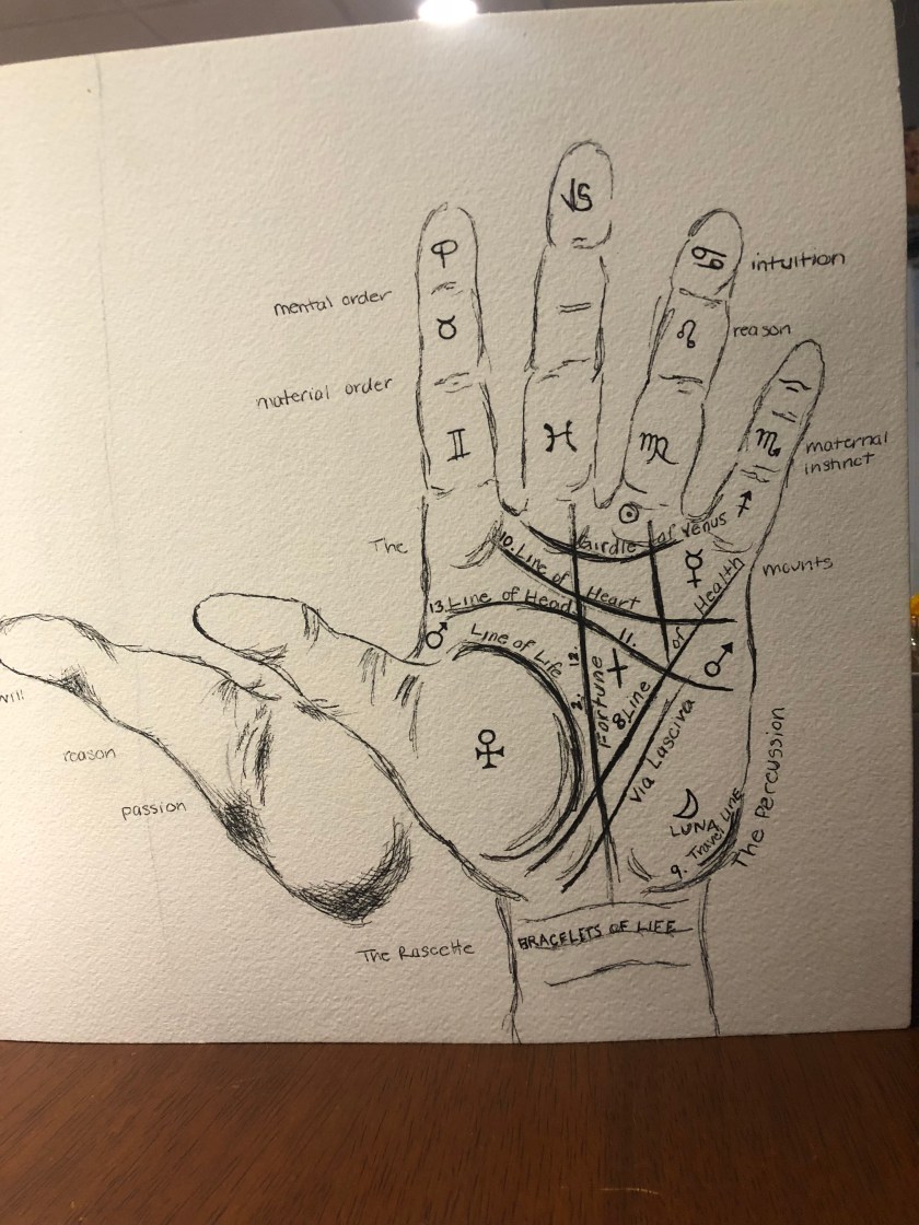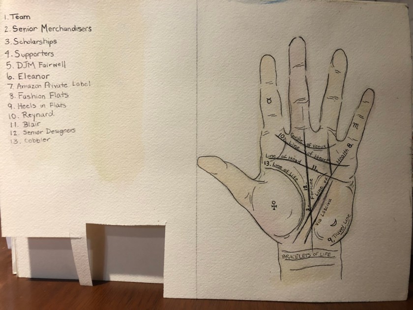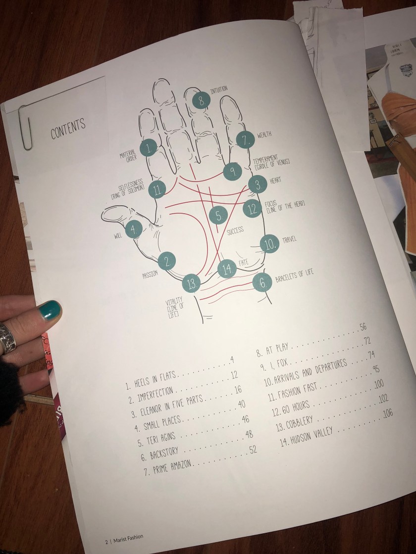 The table of contents was a project of mine for months out of the school year. I introduced the thought of palm reading, attempting to coordinate each story line to a particular palm line. For example, the Alumni story was placed on the line of success, a charitable article on the heart line, and so on. Not only was the research done for each palm line and article meaning, the hand you see is 100% my original artwork. From water color and sketching to using an illustrator pad, it was a process!!