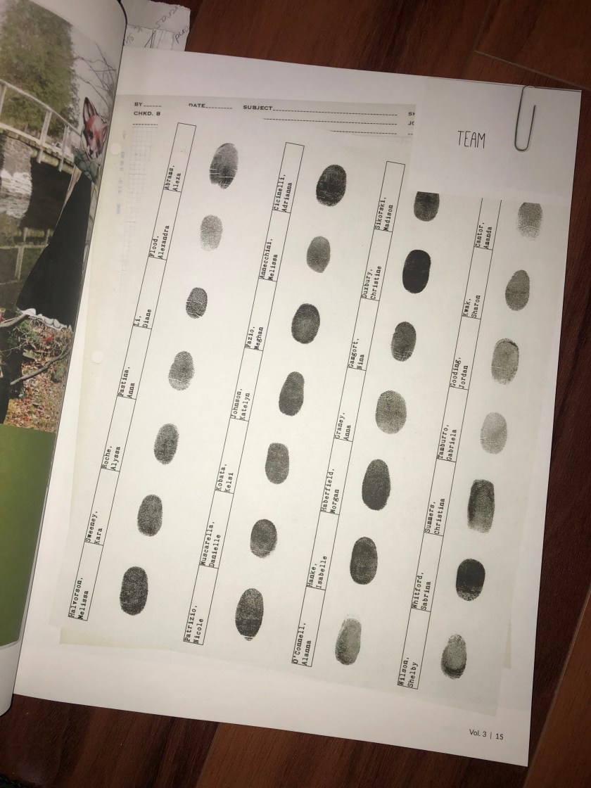 The magazines inlying theme was decided to be “touch.” We (the magazine production class) all contributed our different meanings of touch. From behind the scenes footage, to braille embellishments, and individually stamped thumbs, this magazine collected all aspects of touch. Featured here are the portions in which I initiated the idea and carried out.