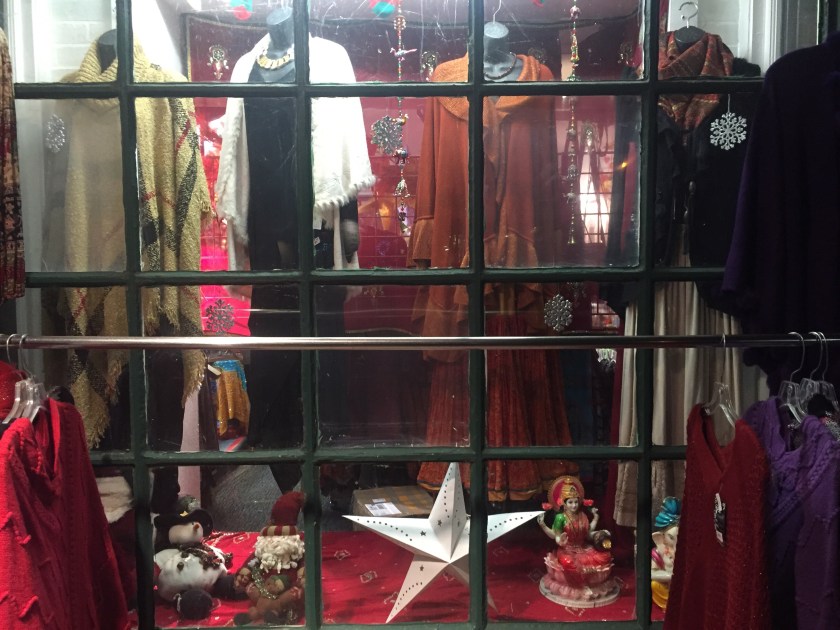 These photos feature before and after shots of the main window of Shop of India, my hometown job. The shop is on historic Main St of New Hope, PA, and therefore the window glass itself it not permitted to be replaced. You can see however the summer display created by a former employee compared to my winter display.