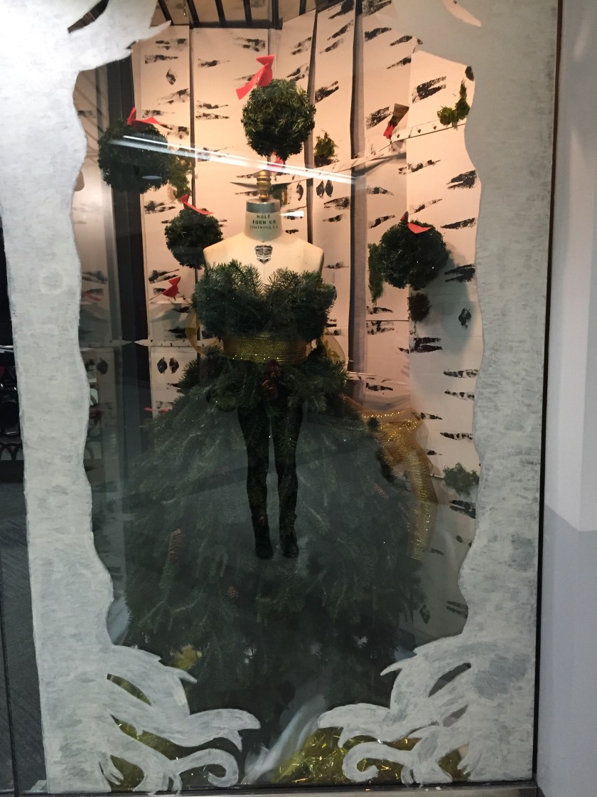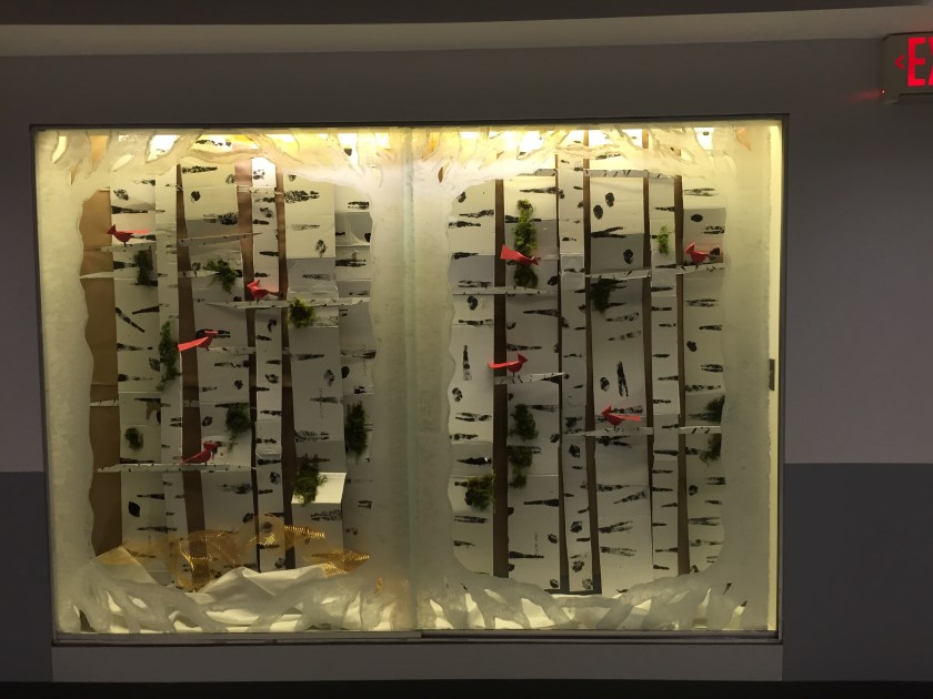 Another Marist Fashion window I was involved with later in the semester is featured in these two photos. While a large group of people worked on the tree portion, I was in charge of the group creating birch trees.