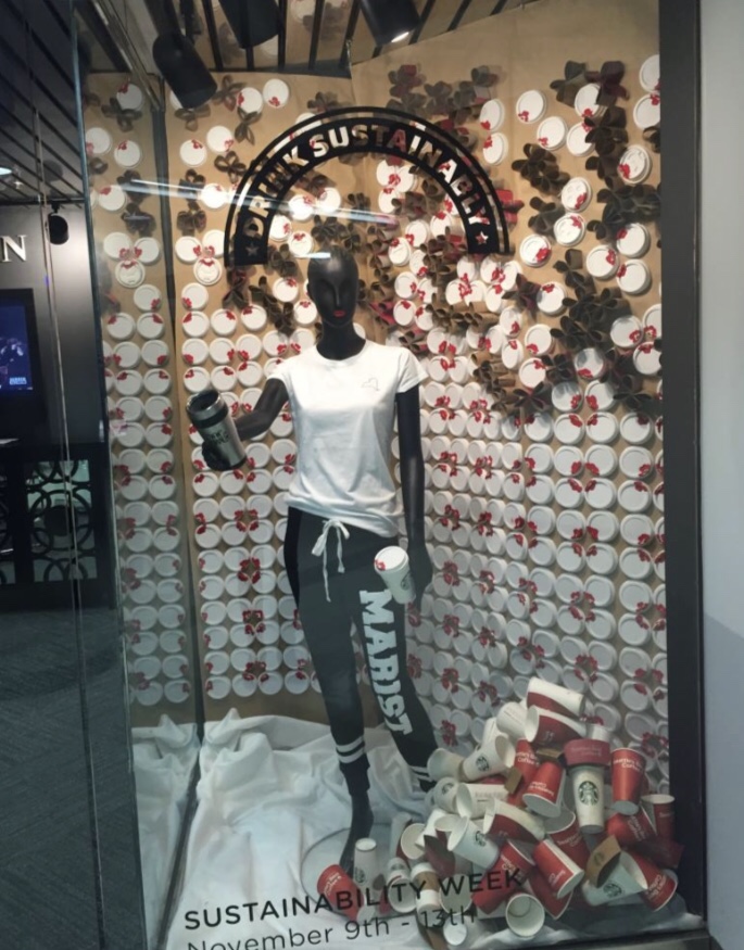 My group ended up winning the contest and I was assigned team leader. This meant finding dimensions, materials, costs, and delegating tasks. But ultimately, I was the one at the end of the day painting coffee lids and hot gluing them to the backdrop. All of the cups and lids featured in this project were used cups collected from trash cans on campus over a two-week period. It was important to show sustainability even in craft. The model wears Marist Mporium apparel and holds out the latest Marist Fashion Travel Mug that we had launch the same week as the window. The Mporium shop is located across the hall from this window.
