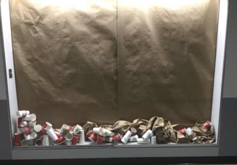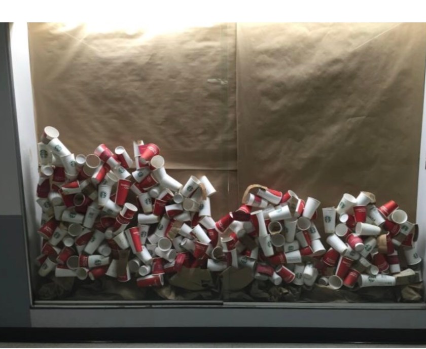 This project was a competition between groups for a window concept. The theme was sustainability day. As a college sophomore, I found inspiration in something very simple- my coffee lid. The lipstick was on the rim, and it looked oddly pretty. I took a photo of it and put it into a picture collage app and rotated the photos, forming a flower-like design from the coffee lids. This was the start of our groups pitch.